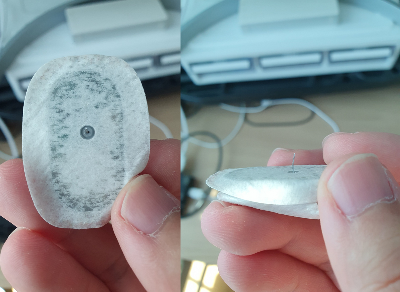 센서는 사용 2주가 지난 시점에서 촬영했는데 매우 얇은 탄성이 있고 부드럽게 휘어지는 0.5cm 침이 달려있다.